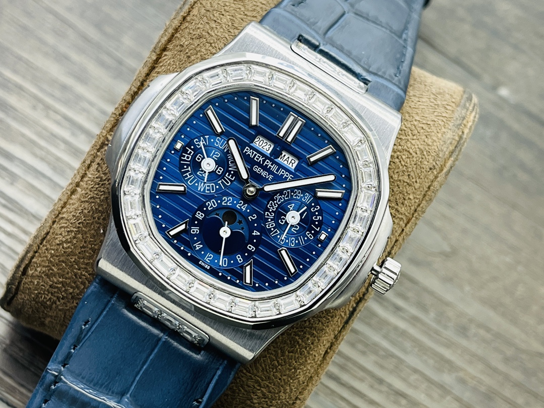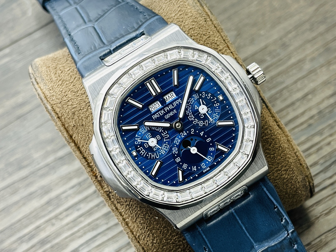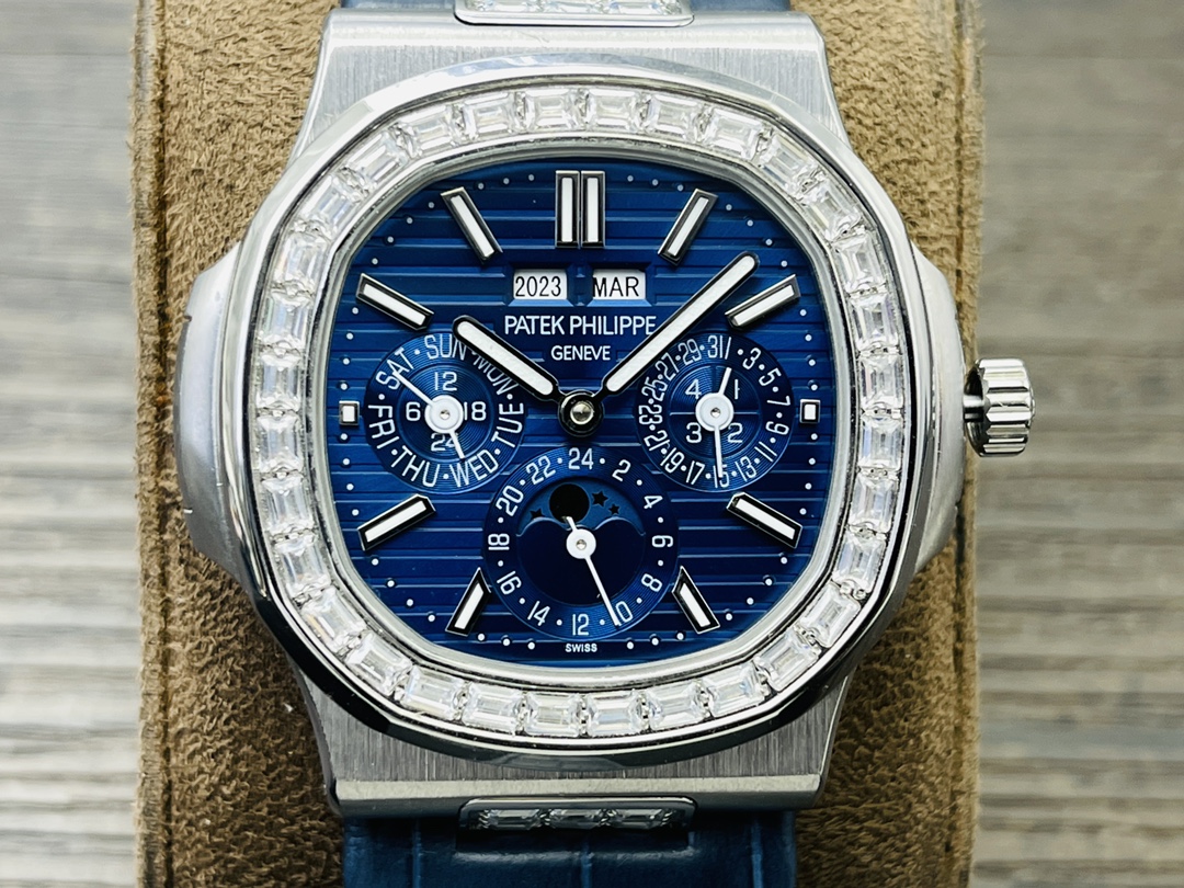 Replica Patek Philippe Nautilus Perpetual Calendar 5740/1G-001 possesses stunning functionality. It's a Swiss white-gold diamond-coated watch of 40mm width. The whole set carries an aristocratic glow. When it comes to other decorations, blue leather also brings class. With it, they could proceed even more classical events or on-sport performances.