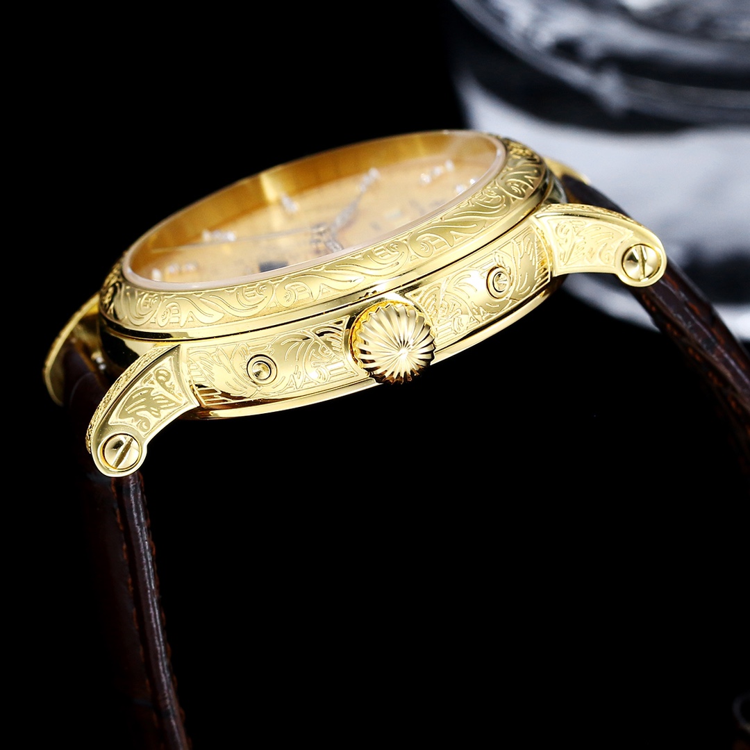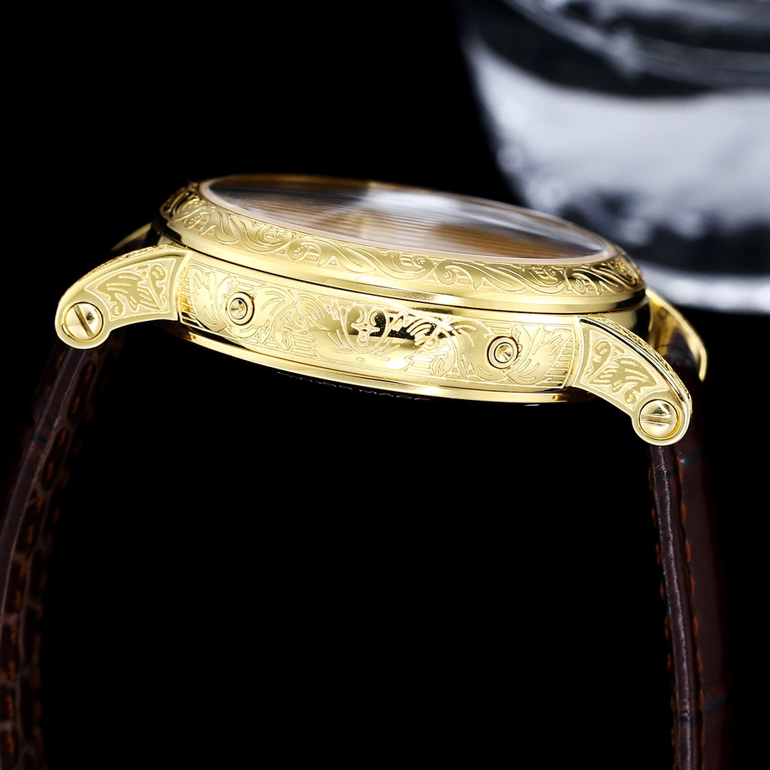 Here’s the Patek Philippe Calatrava 5924G-001 Replica. This stunning timepiece comes in an elegant gold tone case that features an intricately engraved dial with full pattern design, beautiful diamond cut indexes, and fine poire type hands.