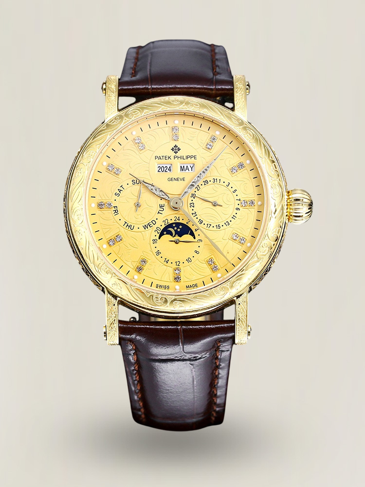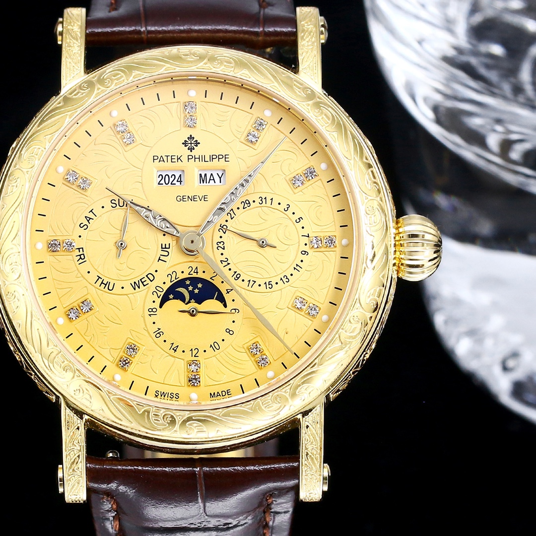 Super Clone Patek Philippe Grand Complications Replica Retrograde Perpetual Calendar Gold Case Gold Engraved Dial Watch