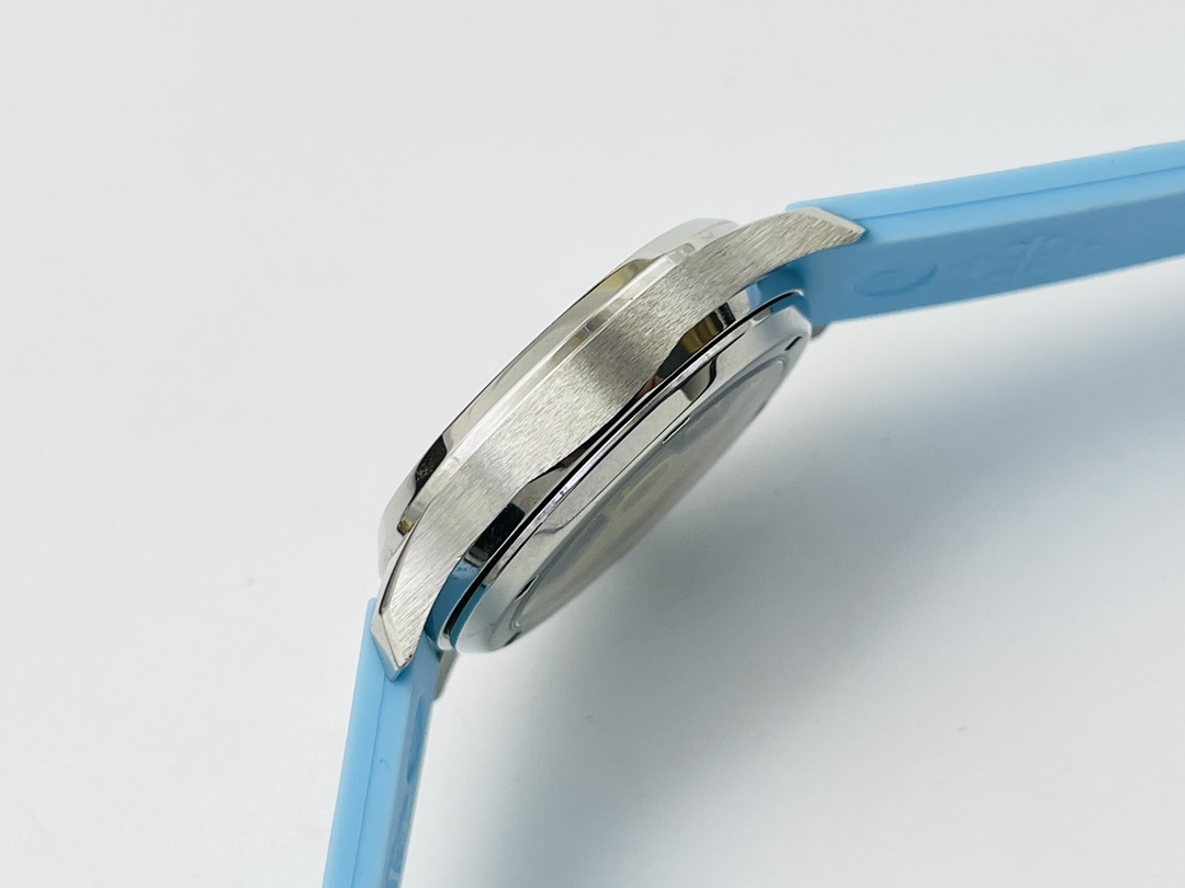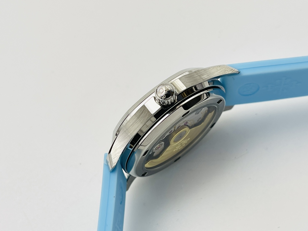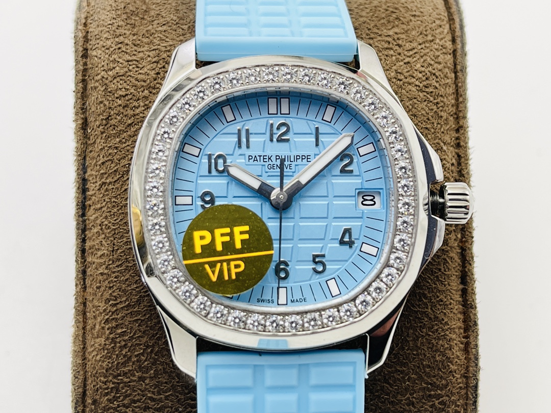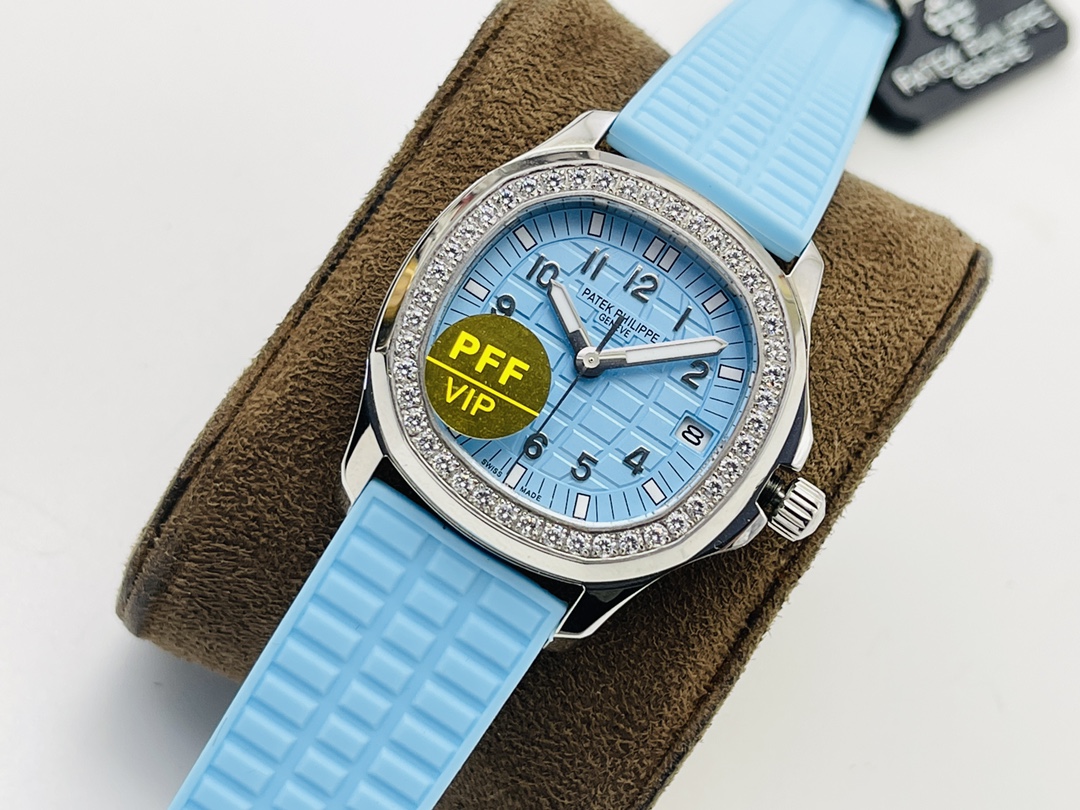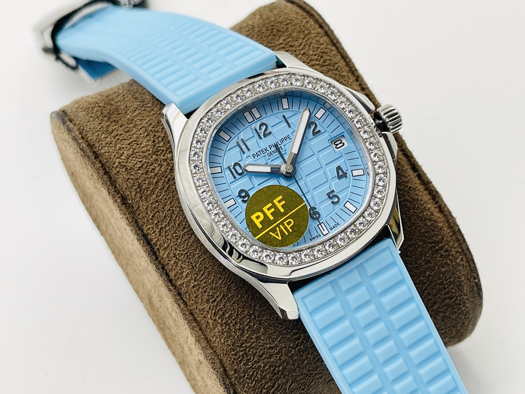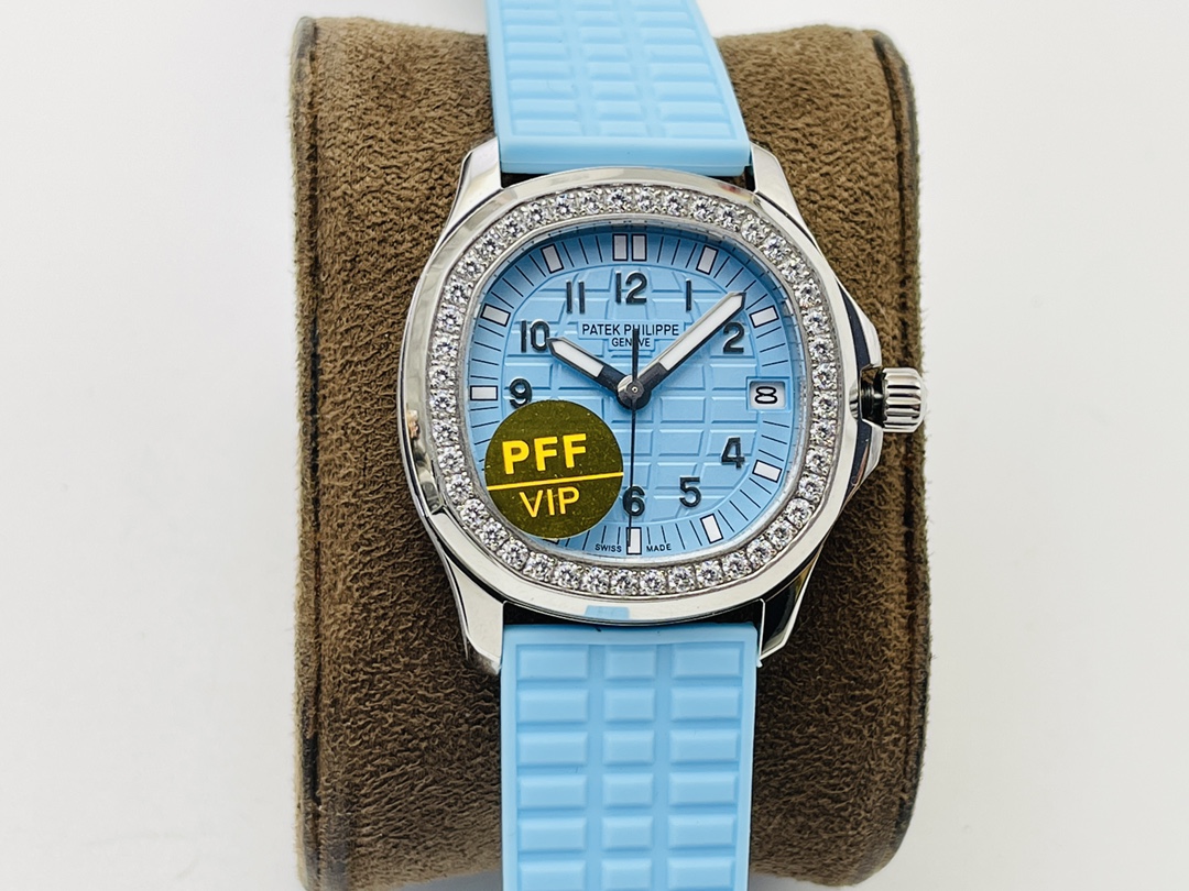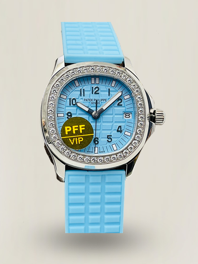 Patek Philippe Aquanaut Luce 5067A-017 replica has an elegant and modern design, with a case measuring 35.6 mm made of stainless steel and a unique light ice-blue color of its dial. Its dial has a famous checkerboard engraving characteristic of all Patek Philippe Aquanaut watches, complemented by Arabic numbers, minute track, sword-shaped hands, and a date display positioned at three o'clock. The bezel is encrusted with diamonds. It is also mounted on a blue rubber strap.